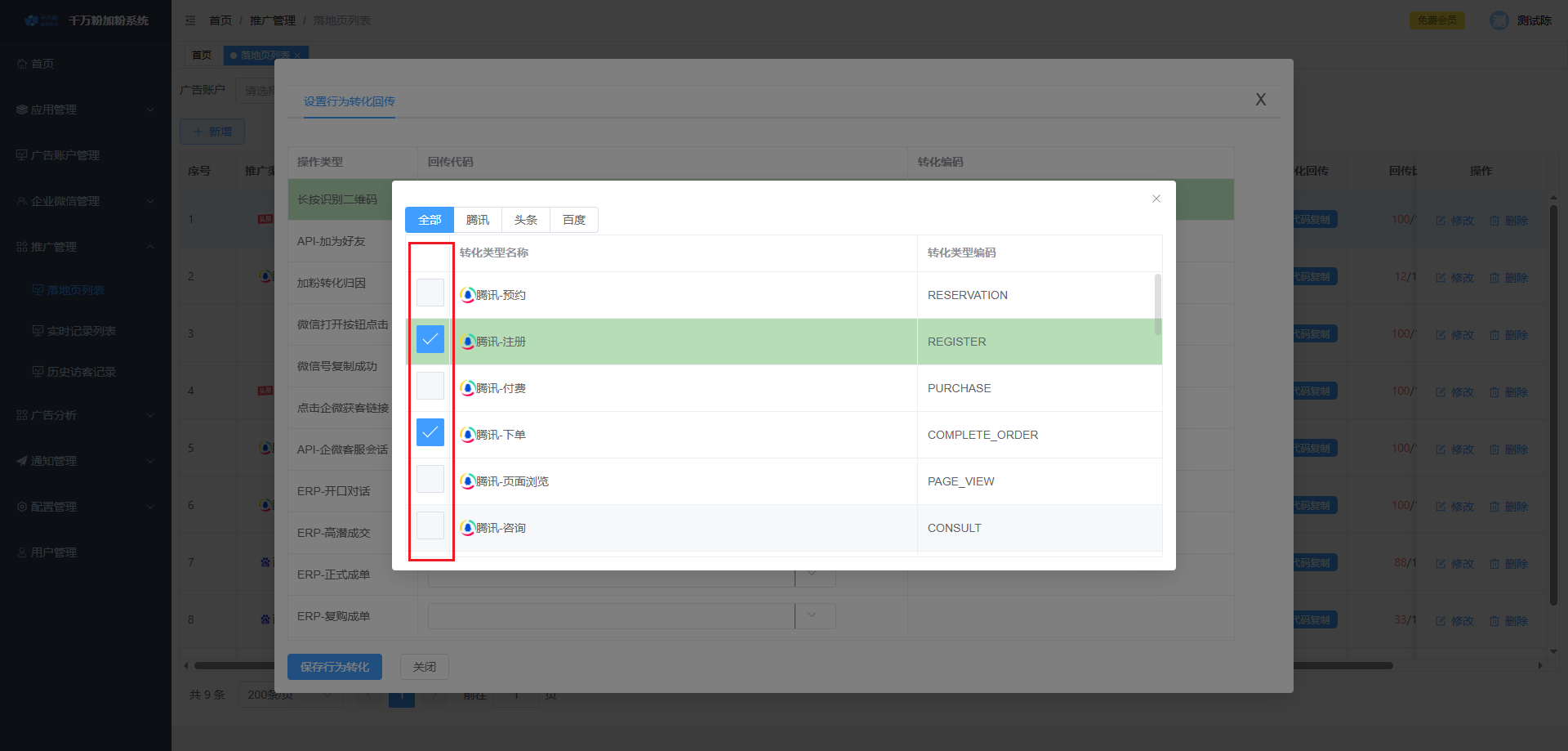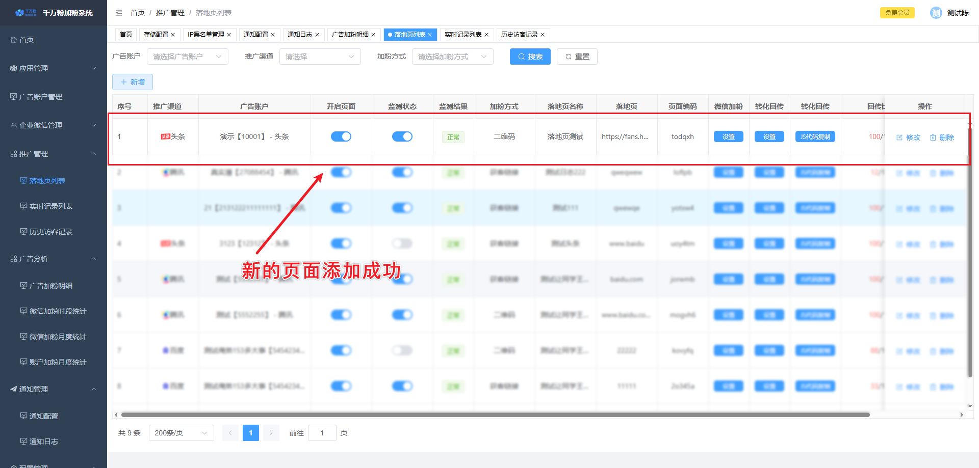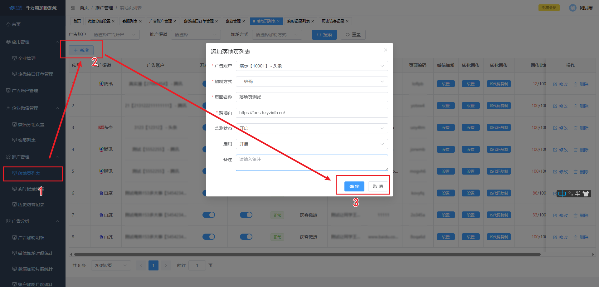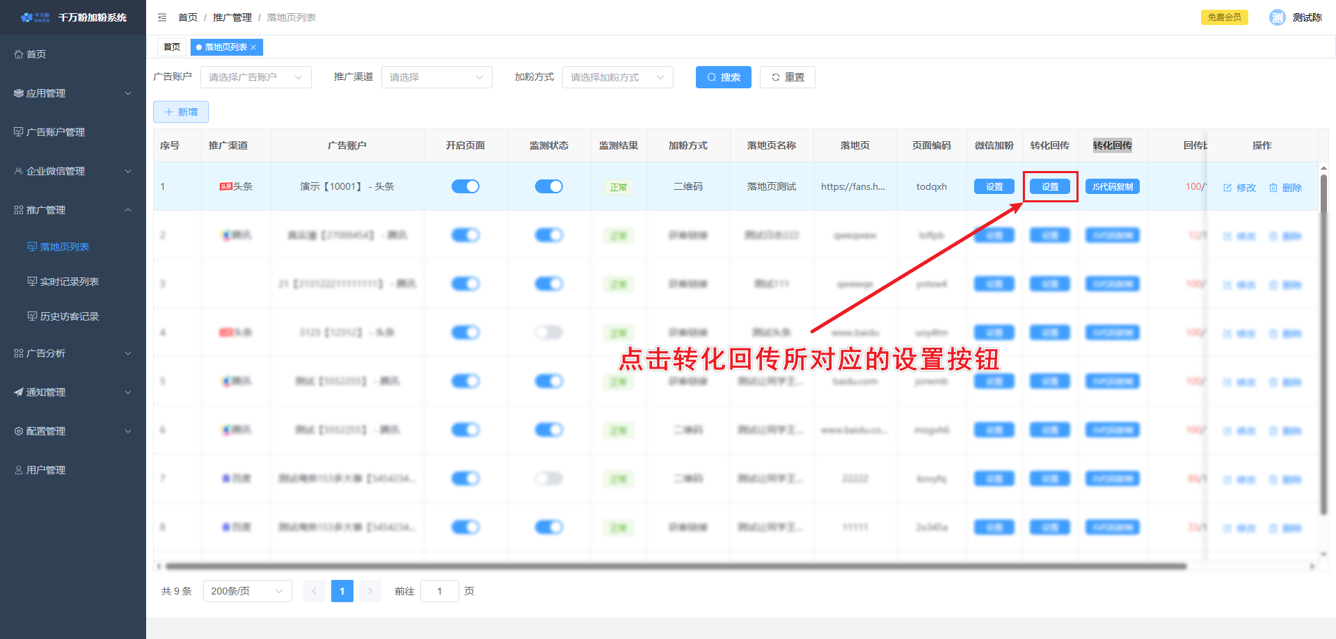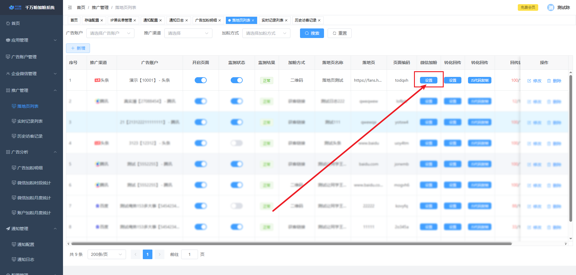 此页面可对落地页进行添加,设置微信加粉, 设置转化回传