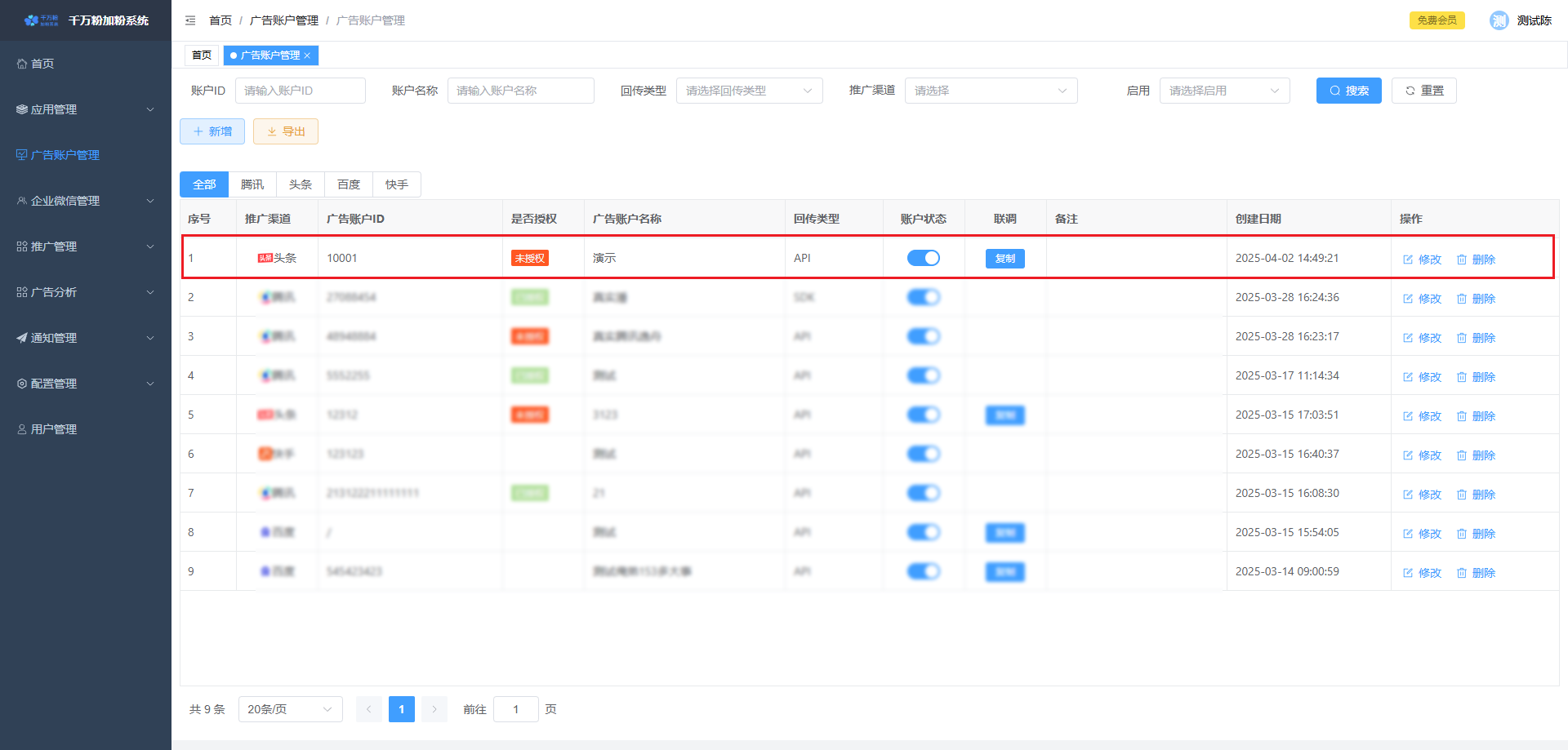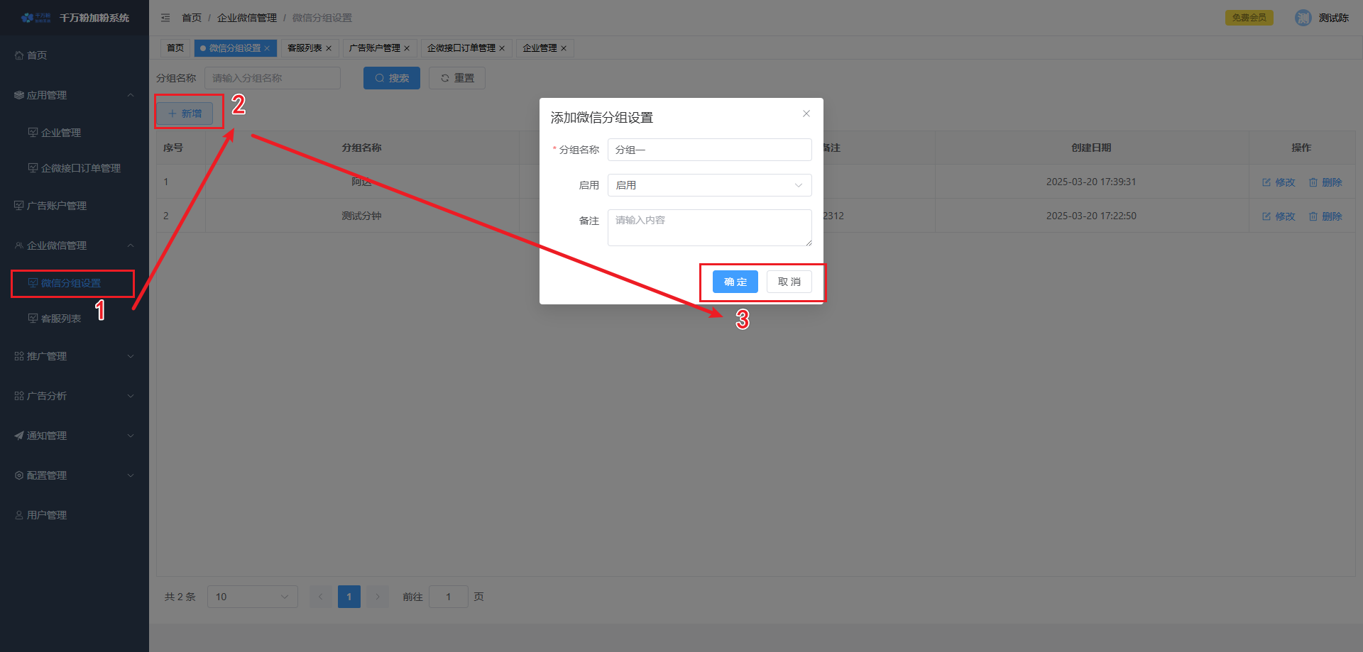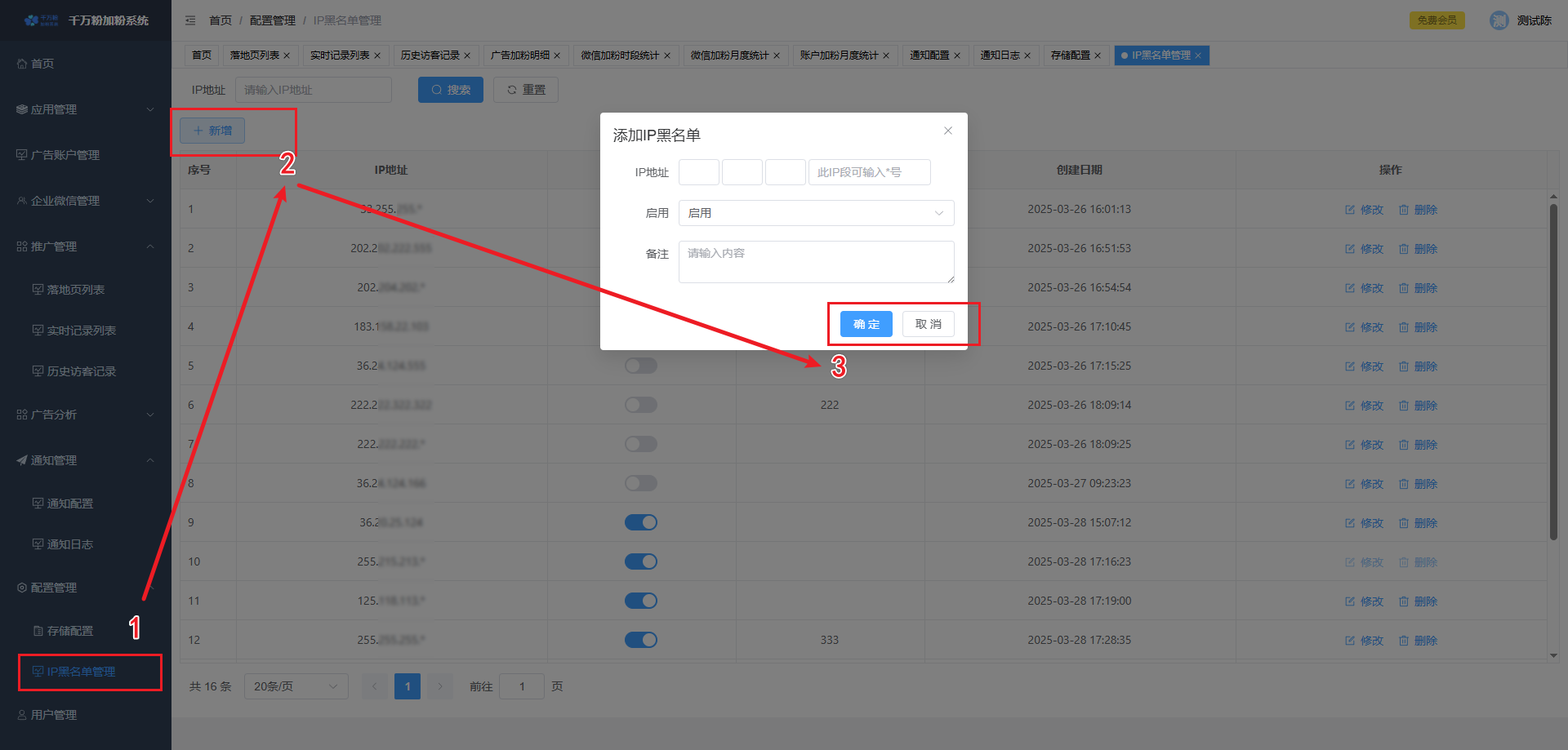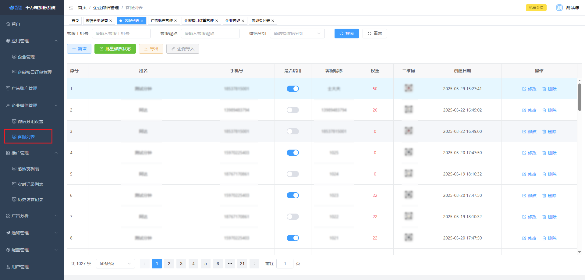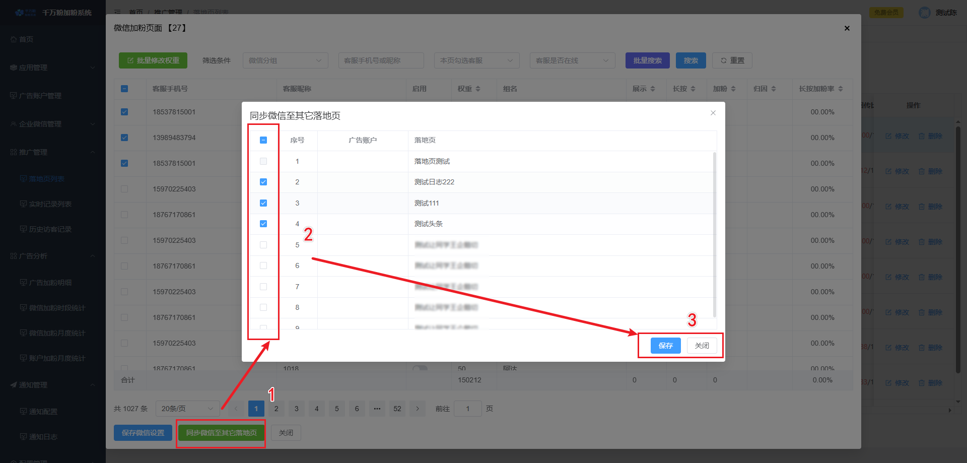 此页面可对落地页进行添加,设置微信加粉, 设置转化回传