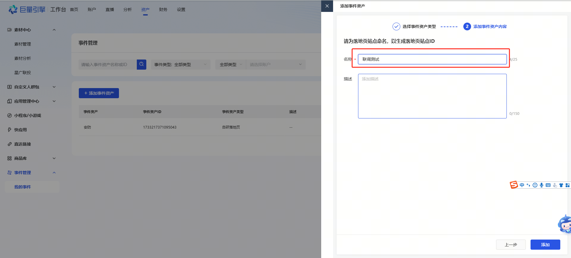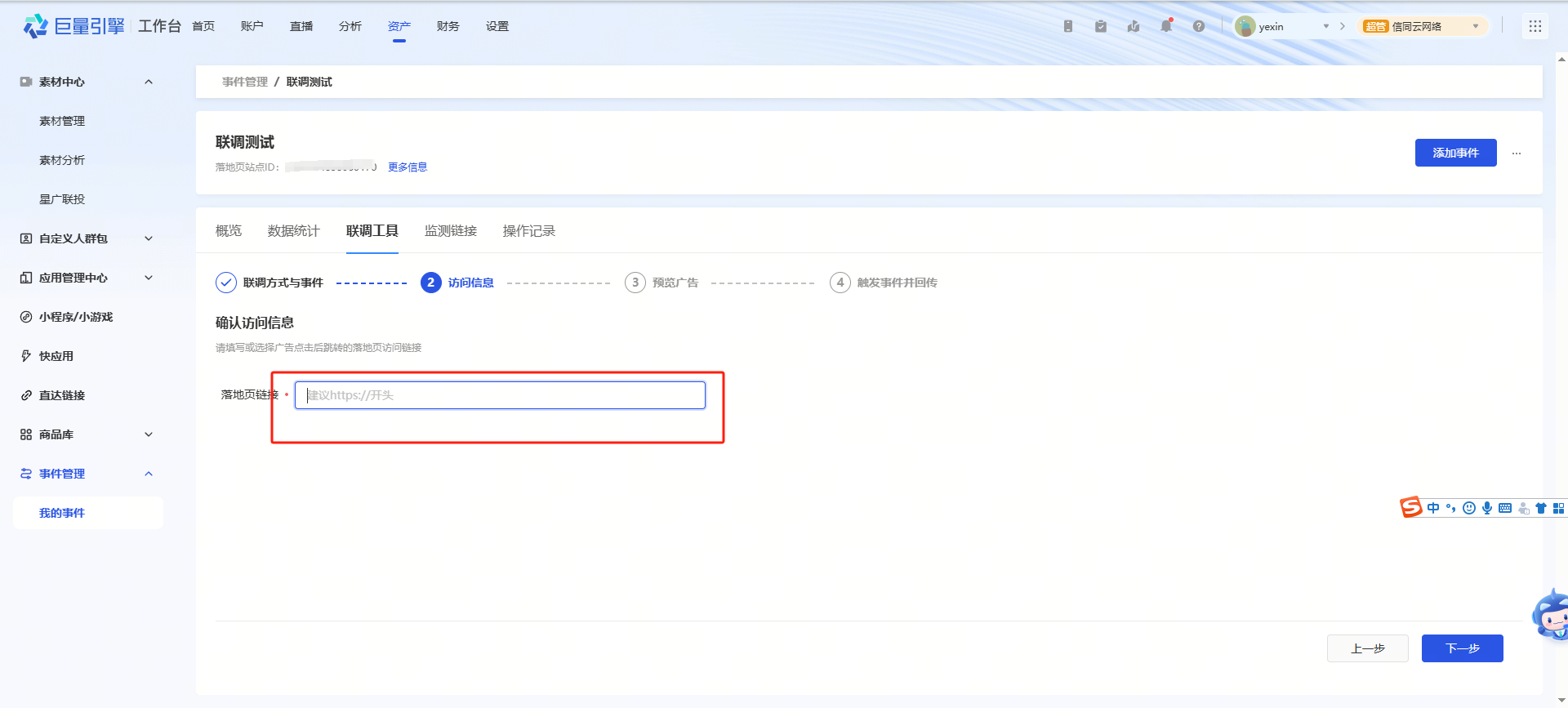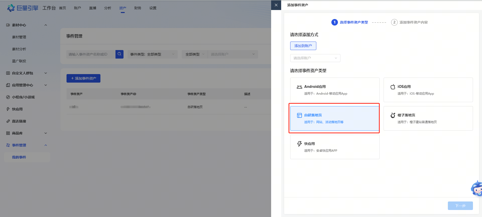 新增落地页,填写或选择广告账户等信息