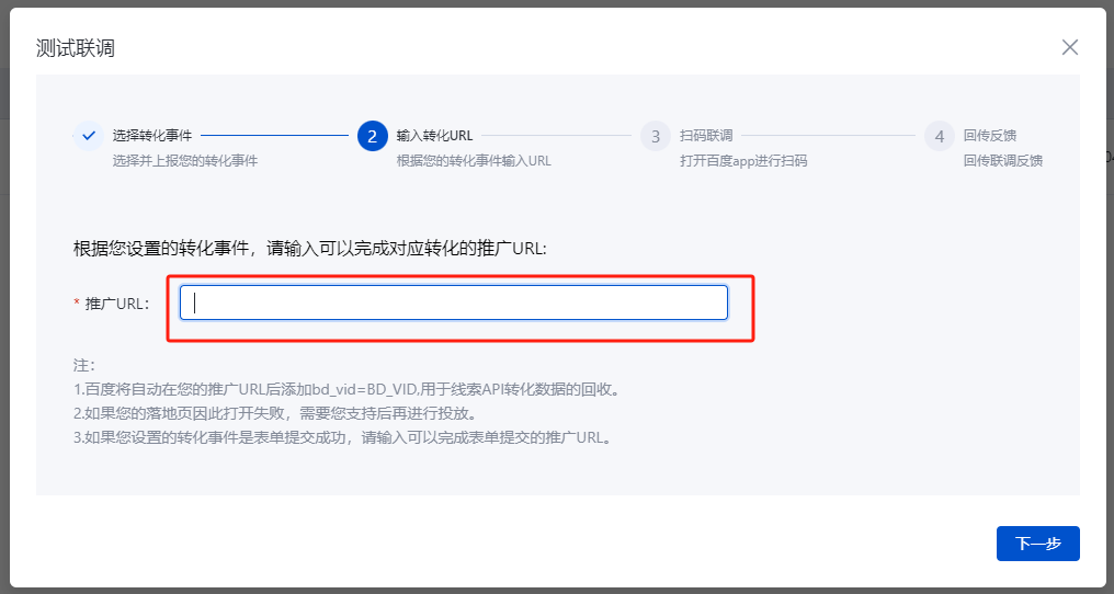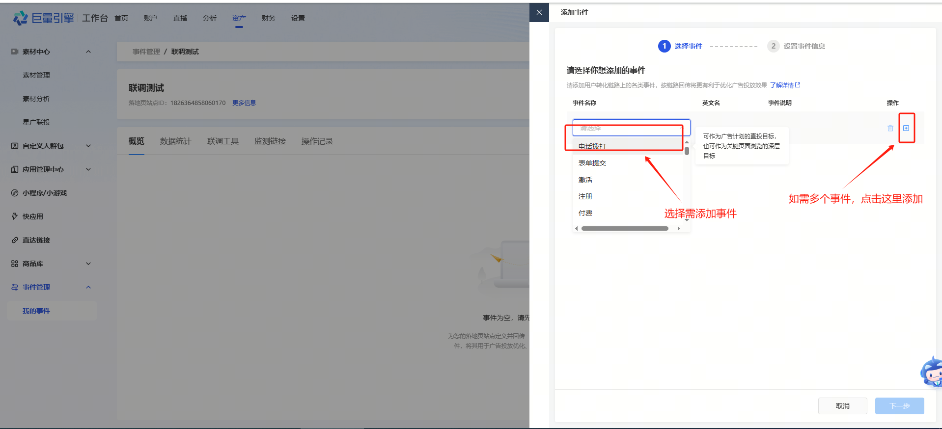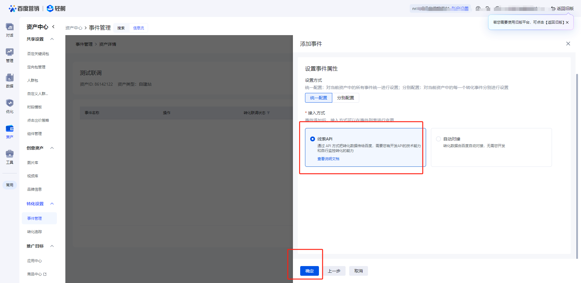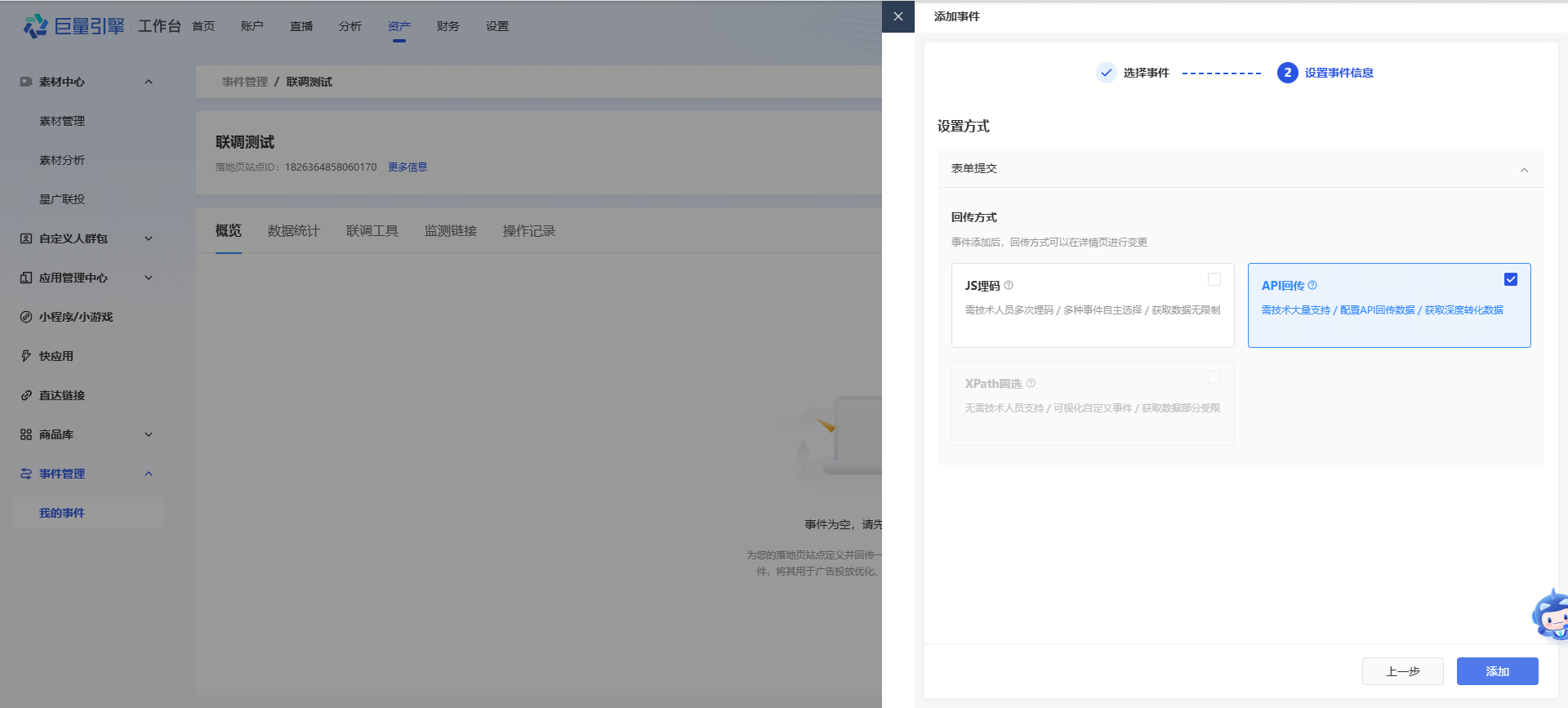 设置转化回传:设置所需监听的用户行为,将其返回至广告平台,优化推广效果。