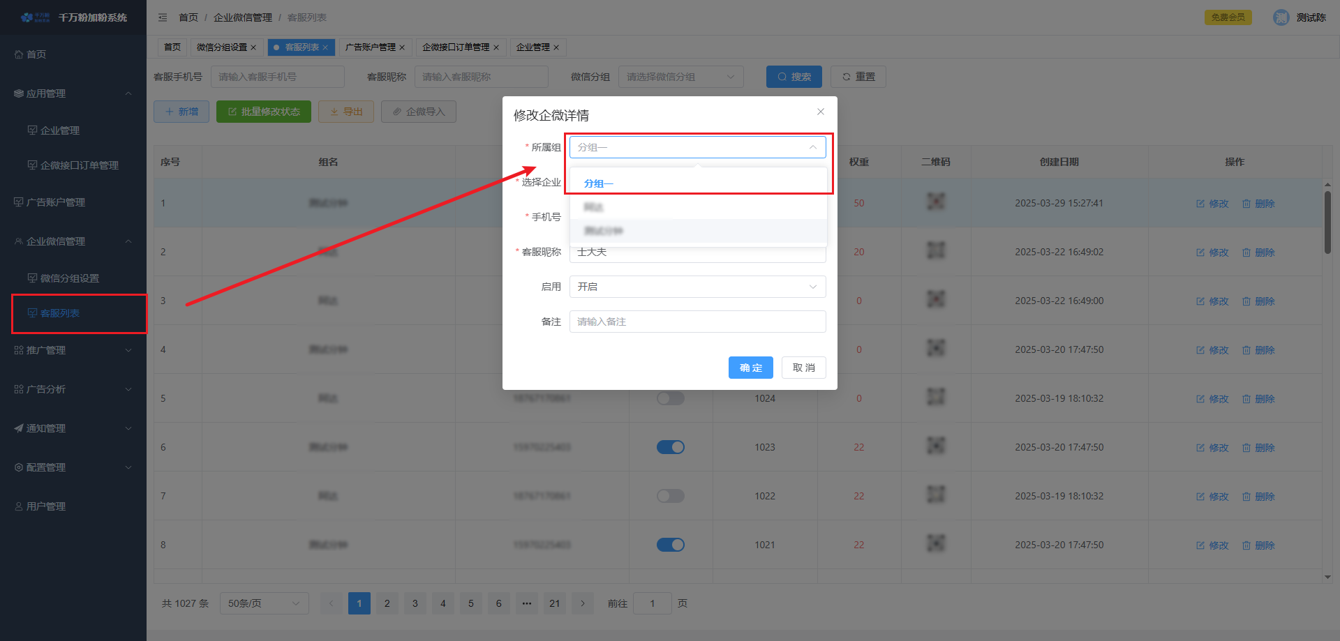 2-2:弹窗打开后,勾选当前页面所需要展示的客服微信