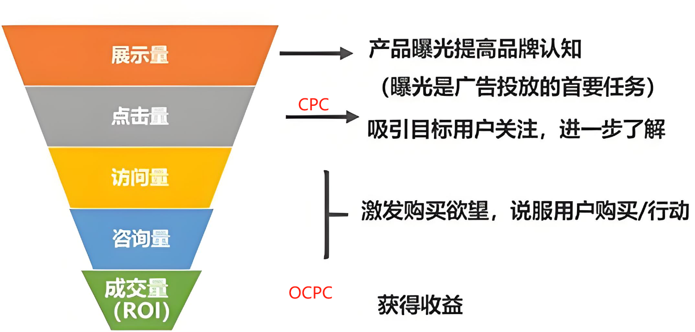 通过广告模型漏斗,可以很直观的看到,CPC比OCPC链路更短,但OCPC比CPC更接近成交,用户线索更精准。