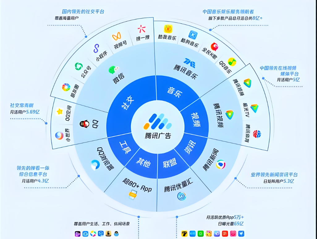 旗下的信息流广告投放渠道包括视频号、朋友圈、公众号、小程序、腾讯新闻、腾讯视频等,还有QQ生态的浏览器、QQ音乐、QQ空间、游戏、购物等,预估单日最大覆盖用户10亿+,曝光100亿+